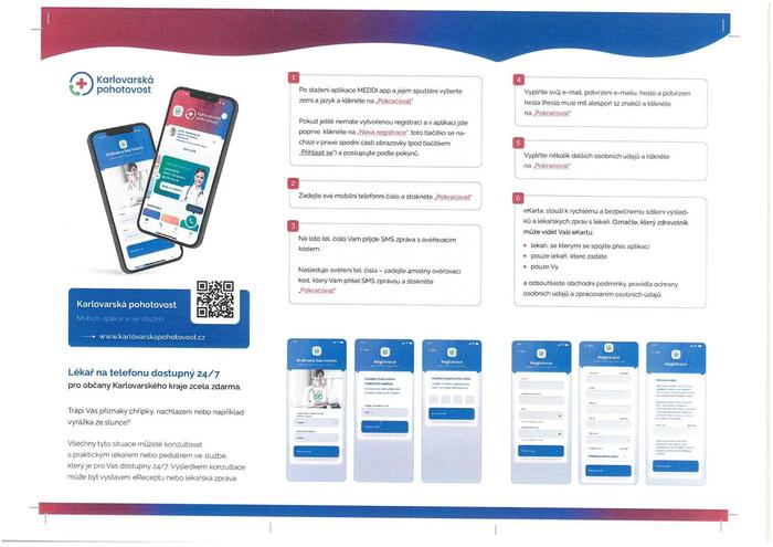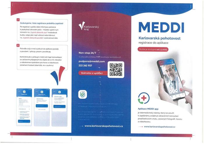 Karlovarský kraj od 1.3.2025 zajistil pro občany novou zdravotní službu tzv. online pohotovost. Online pohotovost doplňuje systém zdravotních pohotovostních služeb v Karlovarském kraji. Je provozována 24 hod denně, 7 dní v týdnu, tedy včetně víkendů a svátků. Je určena občanům v Karlovarském kraji, je poskytována zdarma a bez omezení počtu přístupů. Pro komunikaci s lékařem je potřeba stáhnout aplikaci MEDDI a do této aplikace se zaregistrovat. Aplikace ke stažení: https://www.karlovarskapohotovost.cz/prihlasit
