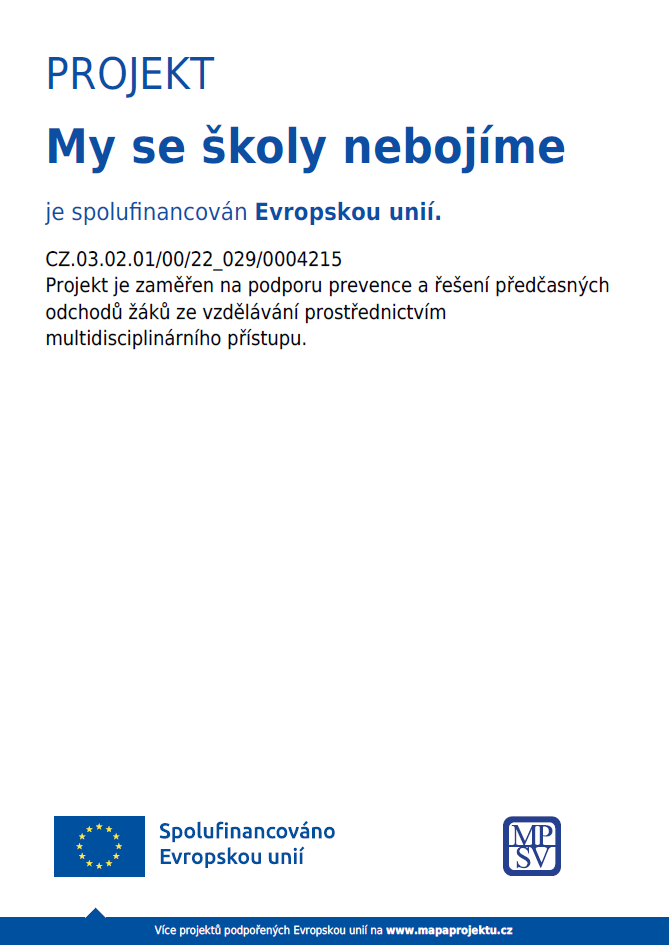 PROJEKT My se školy nebojíme je spolufinancován Evropskou unií. CZ.03.02.01/00/22_029/0004215 Projekt je zaměřen na podporu prevence a řešení předčasných odchodů žáků ze vzdělávání prostřednictvím multidisciplinárního přístupu.